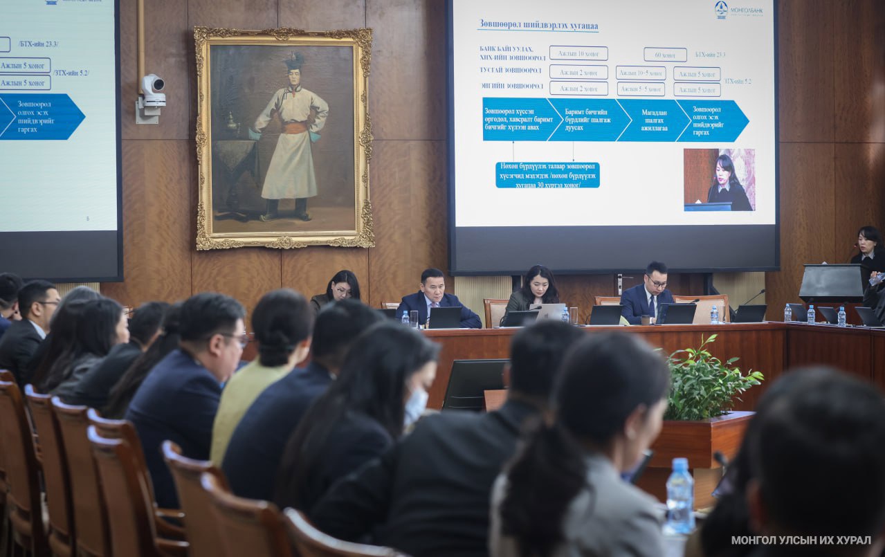 Үүний дараа банк, банкнаас бусад санхүүгийн зөвшөөрлийн талаар Монгол банкны Зөвшөөрлийн албаны даргыг түр орлон гүйцэтгэгч Г.Намуун танилцуулав. Зөвшөөрлийн тухай хуулиар Монгол банкнаас 5 тусгай зөвшөөрөл, 25 төрлийн энгийн зөвшөөрөл олгодог. Зөвшөөрөл олгохтой холбоотой нөхцөл шаардлагуудыг Банкны тухай хууль, Үндэсний төлбөрийн системийн тухай хууль, Төлбөр тооцоог үндэсний мөнгөн тэмдэгтээр гүйцэтгэх тухай хууль, Зээлийн мэдээллийн тухай хуулиар зохицуулдаг. Зөвшөөрлийн тухай хууль хэрэгжиж эхэлснээс хойш Монголбанкнаас зөвшөөрөл олгох харилцаанд хэд хэдэн хүндрэл бий. Тухайлбал, Банкны тухай хуулийн 3.1.13-т "банкны нэгж" гэж банкны салбар, төлөөлөгчийн газар, тооцооны төв, тооцооны касс зэрэг хуулийн этгээдийн эрхгүй байгууллагыг хэлнэ" гэж заасан, гэвч Зөвшөөрлийн тухай хуулийн 8.2 дугаар зүйлийн 2.2-т "банк, түүний салбар байгуулах, гадаад улсад банк, банкны салбар байгуулах"-д энгийн зөвшөөрөл олгоно гэж заасан байгаа нь Банкны тухай хуульд заасан банкны нэгжийн зөвшөөрлийн эрх зүйн зохицуулалтыг хэрэгжүүлэхэд хүндрэлтэй нөхцөлийг үүсгэж байна. Мөн Зөвшөөрлийн тухай хуульд тусгай болон энгийн зөвшөөрлийг олгоход ирүүлсэн баримт, бичгийг судалж шийдвэр гаргах хугацаа хангалттай биш бөгөөд магадлан шалгах, газар дээр нь очиж баталгаажуулах, мэргэжлийн байгууллагаар дүгнэлт гаргуулах зэрэг ажиллагааг тус хугацаанд амжуулахад хүндрэл тулгардаг. Зээлийн мэдээллийн тухай хуульд тусгай болон энгийн зөвшөөрлийг сунгахтай холбоотой зохицуулалтгүй тул Зөвшөөрлийн тухай хуулийг баримталдаг. Ийнхүү богино хугацаанд сунгах ажиллагааг гүйцэтгэх нь газар дээр очиж баталгаажуулах, магадлан шалгах ажиллагаанд хүндрэл учруулж, үр дүнд сөргөөр нөлөөлөх эрсдэлтэй гэлээ.