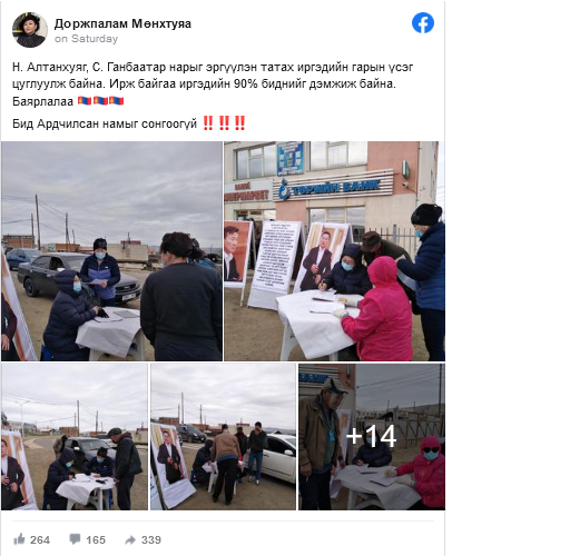 Тэд "Н. Алтанхуяг, С.Ганбаатар нар Орхон аймгийн олон мянган иргэдийн итгэлийг уландаа гишгэж албан тушаал эрх мэдлийн төлөө УИХ-ын гишүүний эрх мэдлээ ашиглан хууль бус үйлдэл гарган цар тахлын онцгой нөхцөлд төрийн эсрэг үймээн самуун дэгдээж байгааг эсэргүүцэж байна. Орхон аймгийн иргэд бид УИХ-ын гишүүнээс нь ЭРГҮҮЛЭН ТАТАХ шаардлага бүхий гарын үсэг цуглуулж байна" гэсэн үгтэй зарын самбаруудыг байршуулжээ.