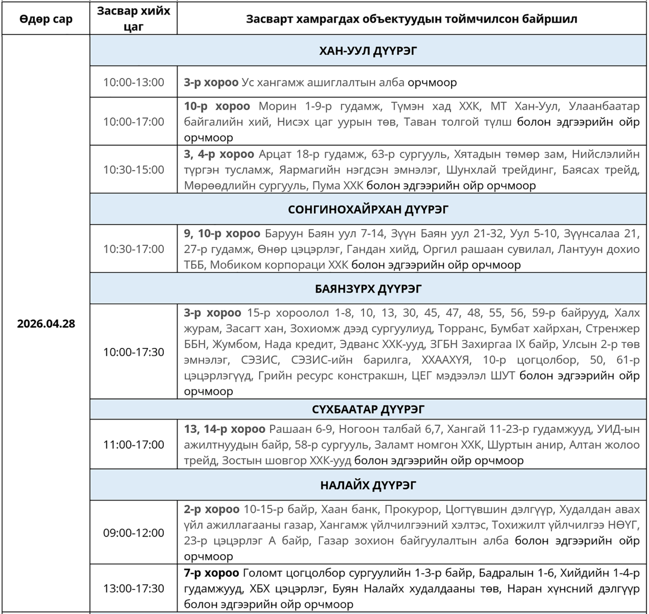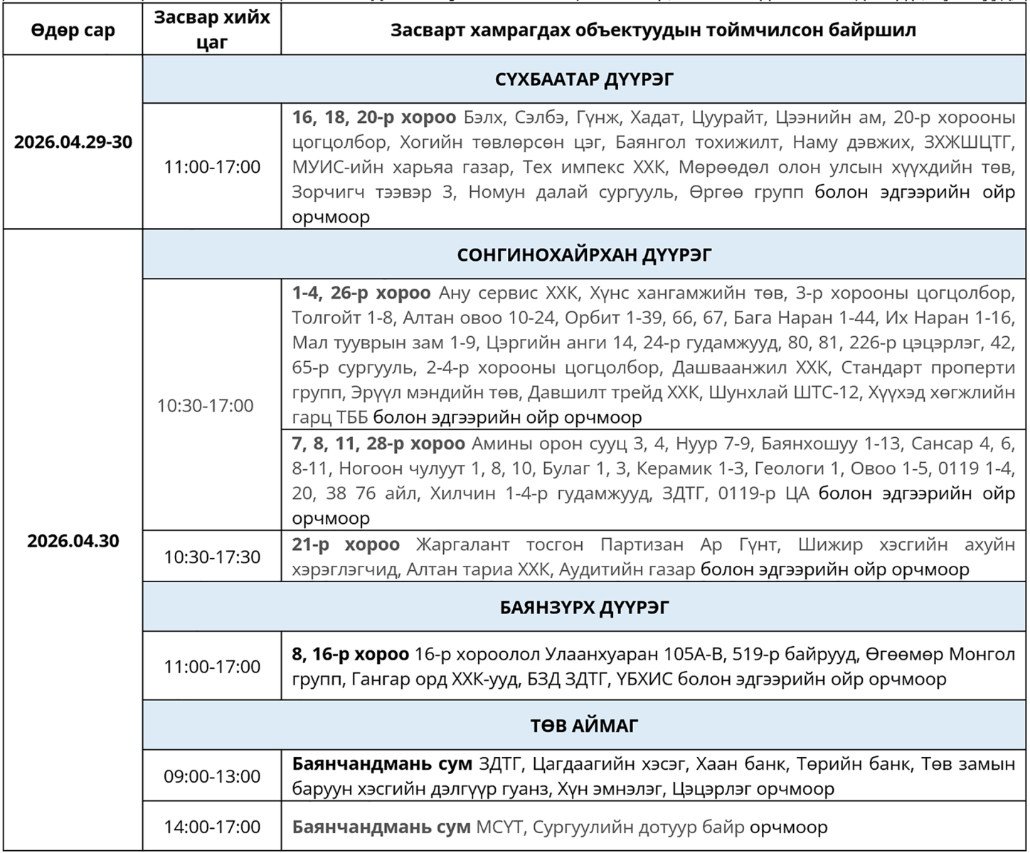 Энэ долоо хоногт буюу 2026 оны дөрөвдүгээр сарын 27-ноос 30-ны дуустал нийслэлийн цахилгаан шугам сүлжээнд хийх засварын хуваарийг танилцуулж байна.